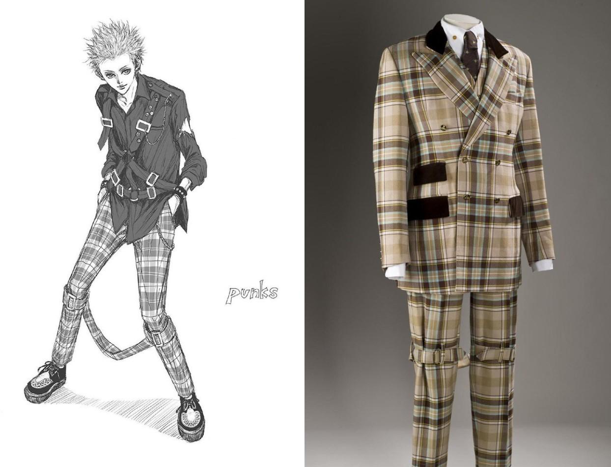 En muchas ocasiones los personajes llevan ropa de cuero y cadenas, lo que utilizan como armadura para proteger su vulnerabilidad, ya que ninguno está libre de traumas y sufrimiento. Otro personaje que utiliza la ropa como vía de escape y expresión personal (también de Vivienne Westwood) es Shin, quien transmite su desacuerdo con sus padres y con la sociedad a través del estilo punk. Utiliza ropa de estudiante, ya que tiene 15 años, pero con cadenas y arneses de la colección “Bondage” de 1974 de Westwood (fig. 14 y 15) para diferenciarse de los valores que la sociedad clasista de Japón quiere imponer a las personas desde pequeñas. También muestra su adultez prematura y su deseo de comenzar una transición para dejar atrás sus traumas del pasado.
