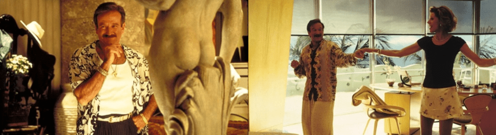 Pero donde Bronson-Howard se luce especialmente es en los momentos cruzados: la cena de ensayo, la llegada de los invitados y los desayunos con tensión. En todos ellos, el vestuario construye una coreografía de distancias. Colores que se oponen y accesorios que sobran. Los personajes no visten para gustar: visten para posicionarse. Incluso el sacerdote (Robin Williams) lleva su sotana con una rigidez teatral, como si supiera que está en mitad de una comedia disfrazada de drama.
