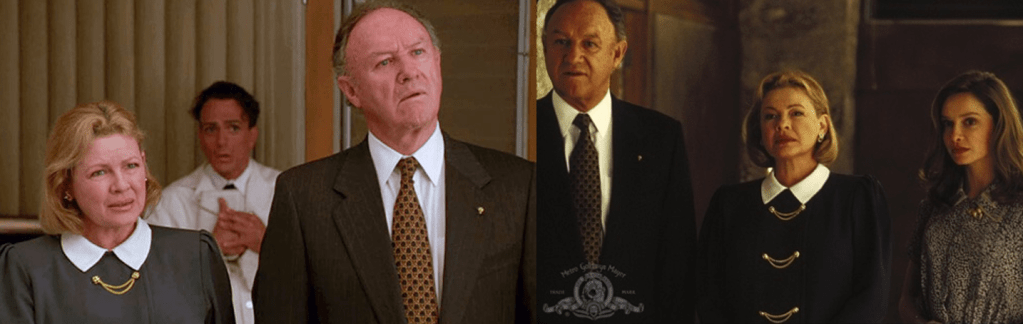 Por supuesto, no podemos olvidar al senador Kevin Keeley (Gene Hackman), y a su esposa (Dianne Wiest), ambos como salidos de un catálogo de la América conservadora de los años 50. Chaquetas de cuadros, tonos neutros, vestidos sin escote y peinados sin sorpresas.
