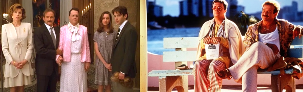 Si el vestuario en la anterior película era una composición de allegros con ocasionales adagios, Una jaula de grillos (Mike Nichols, 1996) es una fanfarria de lentejuelas, boas de plumas y estampados llamativos interpretada a ritmo de conga. Y sin embargo, bajo esa apariencia de desmadre tropical, hay una elegancia más sutil, más arriesgada, que nace de la convicción de ser quien se es, incluso cuando todo alrededor exige lo contrario.