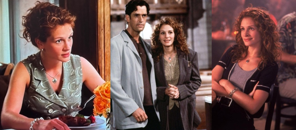 Si esperas que una comedia romántica triunfe en taquilla a pesar del fracaso amoroso de la protagonista, ya puedes procurar que sea buena. Eso sucedió con La boda de mi mejor amigo (P.J. Hogan, 1997). También carece de una escena con un vestido de novia memorable o de una boda campestre bajo guirnaldas de luces como en tantas comedias románticas de Hallmark. Pero sí tiene detalles más perdurables: el estilo premeditadamente imperfecto de Julia Roberts, el satén inocente de Cameron Díaz y una idea de elegancia que se construye a partir de la rivalidad emocional.