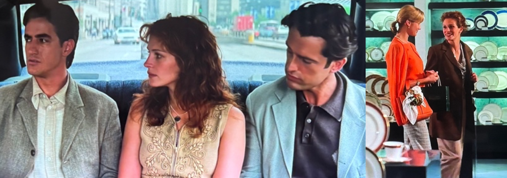 Julianne Potter (Roberts) es crítica gastronómica sarcástica y algo desaliñada. Kurland la rodea de trajes fluidos, blusas de seda, pantalones de pinzas y colores tierra que dialogan con su cinismo. Hay algo deliberadamente anti-nupcial en su apariencia: su vestuario rehúye el blanco, el encaje.