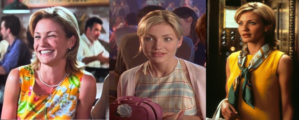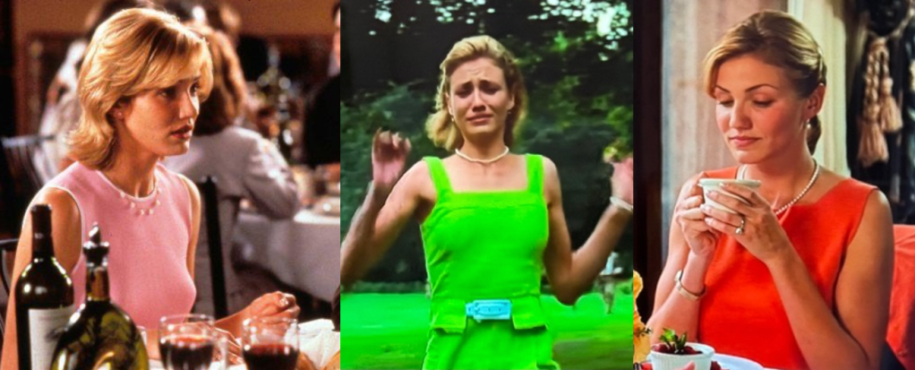 En cambio, Kimberly (Cameron Díaz), con su juventud millonaria y su dulzura de porcelana, es vestida con una gama que va del rosa al amarillo chillón, del verde menta al naranja. Su armario es el de una heredera universitaria que no ha conocido el fracaso ni la envidia. En la escena del karaoke (tan torpe como inolvidable), su vestido sin mangas, en tono lavanda, no solo la hace parecer una flor fuera de lugar, sino que intensifica su fragilidad frente a la mujer que intenta sabotearla.