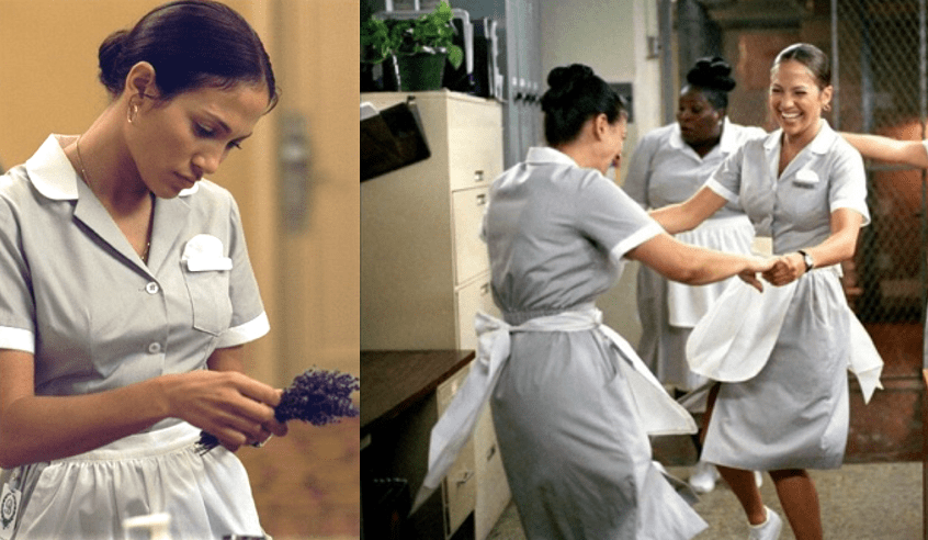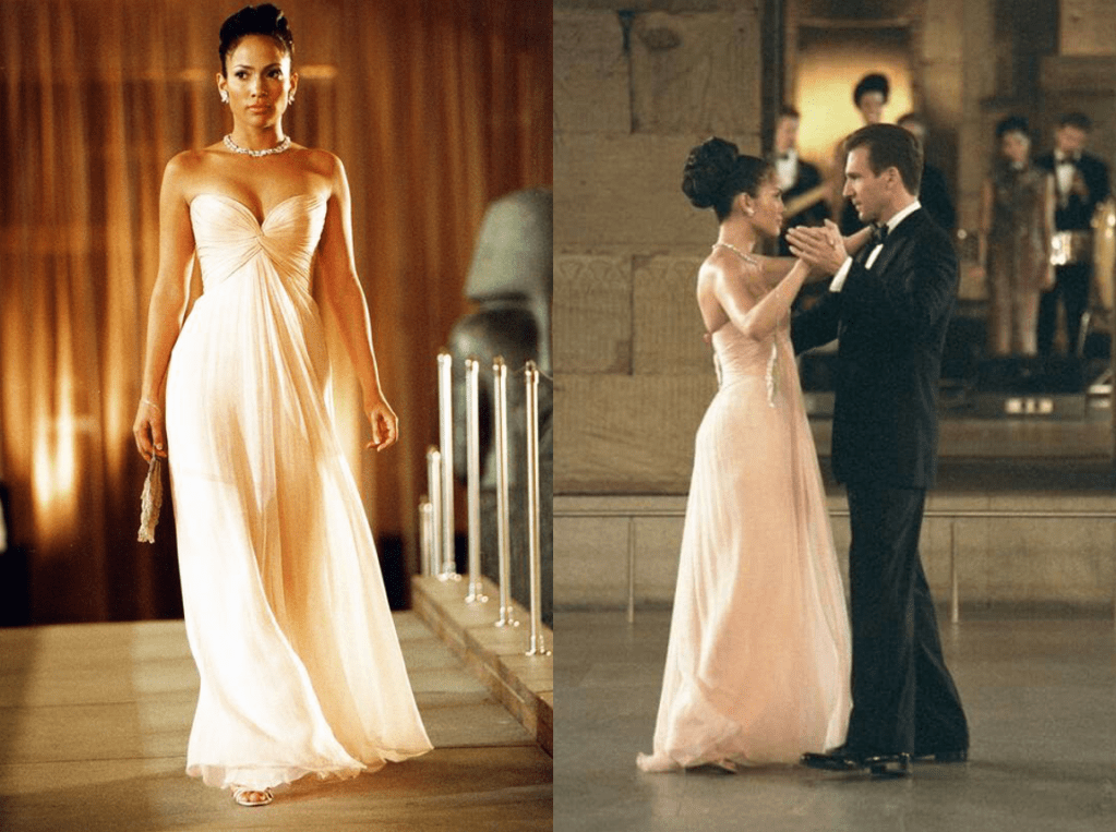 En Sucedió en Manhattan (Wayne Wang, 2002) Marisa Ventura (Jennifer López) es una trabajadora de origen latino, madre soltera y camarera del Beresford Hotel (en verdad el Waldorf Astoria de la Quinta Avenida de Nueva York). Todo se precipita para el cambio de su historia personal cuando se transforma durante unos minutos en una figura de portada y encuentra un espectador inesperado en la figura de Christopher Marshall (Ralph Fiennes), un político neoyorquino con aspiraciones al Senado y perteneciente a una familia adinerada. Ese cambio no será de personalidad, sino de apariencia. Y, en el universo del cuento de hadas moderno, eso basta para que algunas cosas sucedan. Para esa mágica transformación se empleó un precioso conjunto blanco con silueta entallada y abrigo a juego de Dolce & Gabbana.