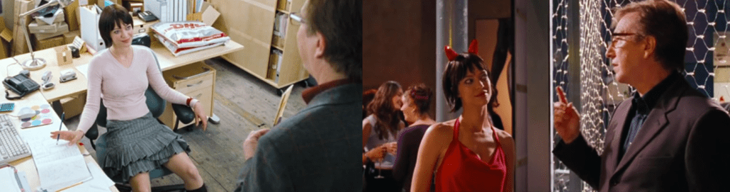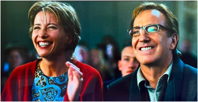Por contraste, Mia (Heike Makatsch), la mujer que coquetea con el marido (Alan Rickman), aparece siempre envuelta en negros entallados, faldas tubo, rojos y escotes suaves. No va disfrazada de mujer fatal, pero casi. Su vestuario está pensado para incomodar: demasiado ajustado, demasiado abierto, demasiado consciente. Una mujer que se viste sabiendo que alguien la mira.