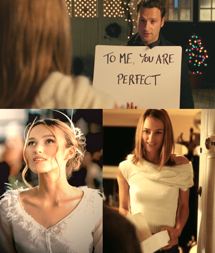 Juliet, la novia interpretada por Keira Knightley, ofrece otra versión de la elegancia: la de lo naíf. Su vestido de novia es de un blanco refulgente, con plumas en los hombros, una caída ligera y un velo delicado. Johnston juega aquí con la idea de la inocencia romántica, ya antes de que irrumpa el famoso cartel con la declaración muda (“Para mí eres perfecta”). Es interesante que, cuando ella descubre ese amor no confesado, lo hace también vestida de blanco.