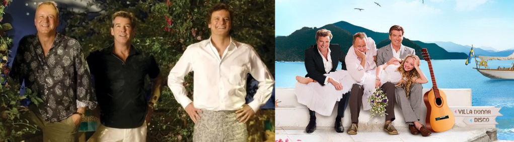 Y, por supuesto, están ellos: Sam (Pierce Brosnan), Harry (Collin Firth) y Bill (Stellan Skarsgard), los tres hombres que llegan vestidos como son, con sonrisa torpe y maleta emocional. Roth los viste como turistas ligeramente fuera de lugar, pero sin convertirlos en parodias. A medida que se integran en la isla, sus camisas se desabotonan, sus zapatos se ensucian, sus americanas desaparecen. Hasta que, en el clímax final (ya en los títulos de crédito), también ellos se entregan al festival de licra. Porque la elegancia, en Mamma Mia! La película, no es resistirse al ridículo: es abrazarlo con estilo.