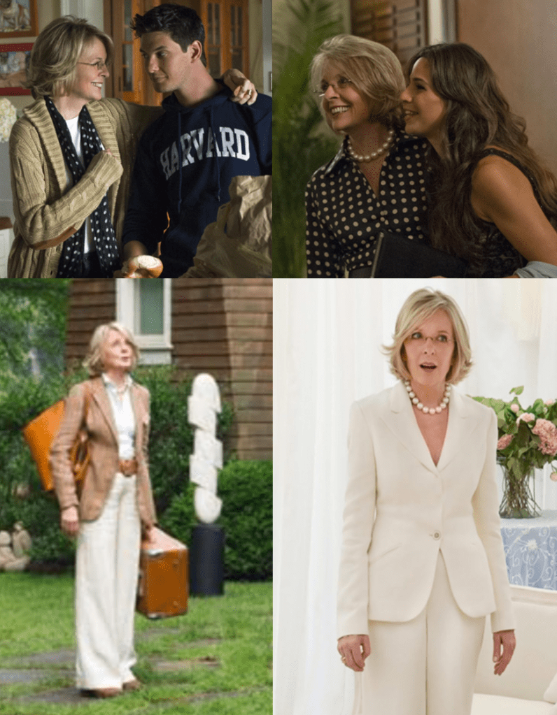 Ellie (Diane Keaton), la madre biológica, llega a la celebración con un estilo de elegancia cosmopolita. Robinson la viste con tonos marfil, grises suaves y tejidos vaporosos: es la clase de exesposa que no necesita dramatismos para imponer su presencia. Hay algo en la caída de sus pañuelos, en la sobriedad de su blusa blanca, que transmite autoridad sin esfuerzo. No necesita competir. Ya ganó.