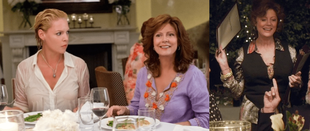 Bebe (Susan Sarandon), la actual pareja del patriarca es todo lo contrario: color, escote, curvas. Su estilo es más emocional: lleva faldas ceñidas, vestidos con vuelo, estampados florales: una especie de alegre desafío a la rigidez de los lazos familiares. Es la mujer que no fue invitada al primer acto, pero que se ha ganado el derecho a estar en escena. Y su ropa lo dice con claridad.