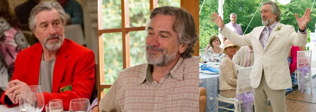 Don (Robert De Niro), el padre que debe fingir matrimonio con su ex aparece impecablemente vestido, pero sin disimular el cansancio vital. Bronson-Howard lo viste con trajes de corte clásico, sin excesos: lo justo para parecer respetable sin esfuerzo. Pero hay algo en la rigidez del cuello de su camisa, en la pulcritud forzada del nudo de la corbata, que sugiere que el disfraz matrimonial le queda ajustado.