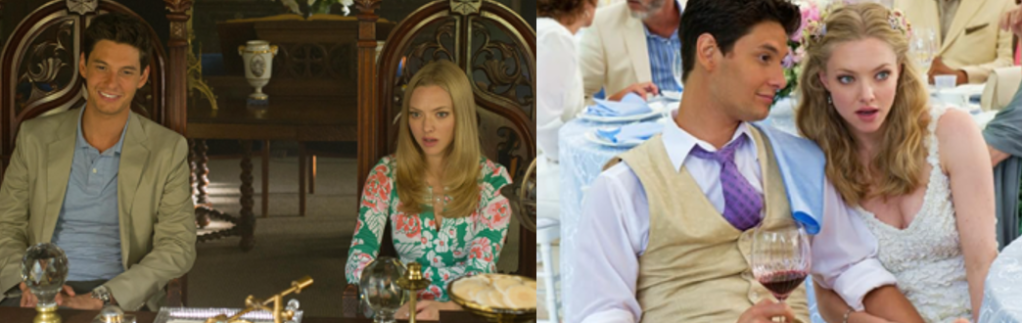 También hay que destacar el vestuario de Sophie (Amanda Seyfried), la hija que inicia la trama al invitar a los tres posibles padres a su boda. Su estilo es blanco, mediterráneo, romántico: blusas ligeras, vestidos de algodón y pies descalzos. Es un estilo que representa la inocencia idealista del personaje. Incluso su vestido de novia (sencillo y con falda fluida) parece decir: “soy joven, pero no ingenua”.