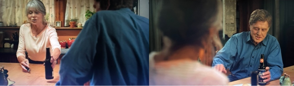 En conjunto, toda la puesta en escena de la película transmite la idea de que amar es cuidar del otro… y sentirse cuidado también. Lo hace por medio del atrezo y del vestuario. Con el atrezo por medio de la bebida que comparten cuando están juntos. En su primera noche ella le ofrece vino. Él preferiría una cerveza, pero tomará una copa de vino para acompañarla.