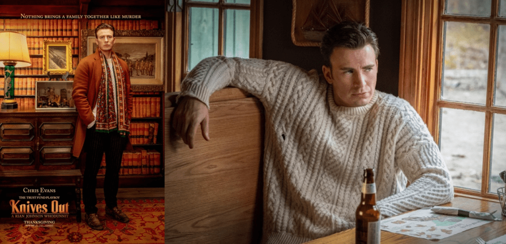 El personaje más icónico del film en términos de vestuario es, sin duda, Ransom Drysdale, interpretado por Chris Evans. Su famoso jersey de ochos en crema (ligeramente oversize, cuello redondo, rematado con un descuido que parece casual pero está meticulosamente diseñado) se convirtió en fenómeno cultural y símbolo del “chico bien” con fondo turbio. Ese suéter, heredero directo de los catálogos de Ralph Lauren, representa la combinación perfecta de privilegio y cinismo. Porque Ransom no viste así para gustar, sino para recordar a todos que puede permitirse no esforzarse.