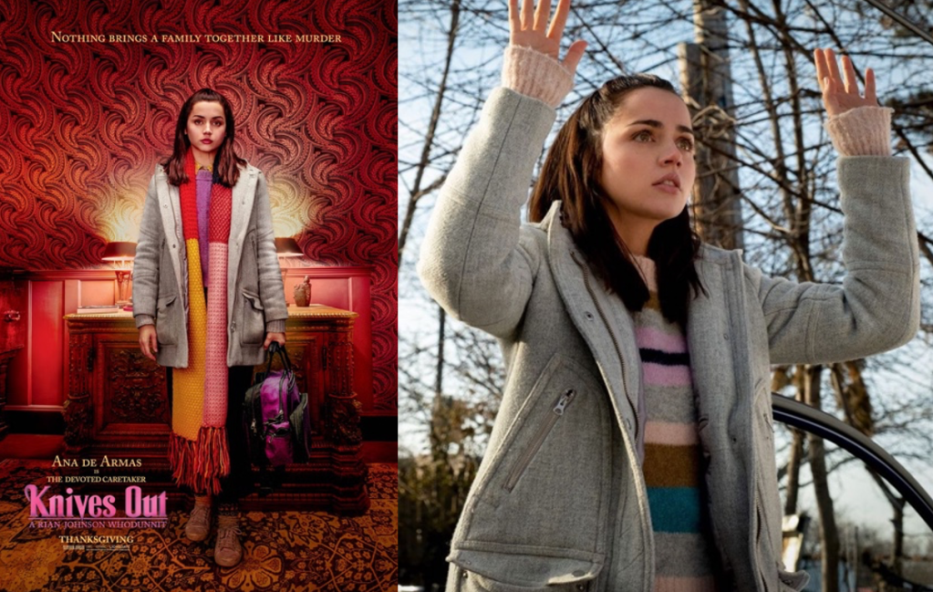 Frente a él está Marta Cabrera (Ana de Armas), la enfermera del patriarca. Su vestuario es sencillo, funcional, sin pretensiones: vaqueros, camisas de cuadros, chaquetas baratas. Y sin embargo, su look es coherente, cuidado, cálido. Representa lo opuesto al resto de la familia Thrombey: una presencia sin artificio. Eagan la viste para no destacar, y por eso, en un mar de ropa cara, es la única que resulta honesta. Su abrigo con capucha se convierte en su seña de identidad: más caperucita que heroína, pero con una brújula moral que ninguna bufanda de cachemir puede reemplazar.