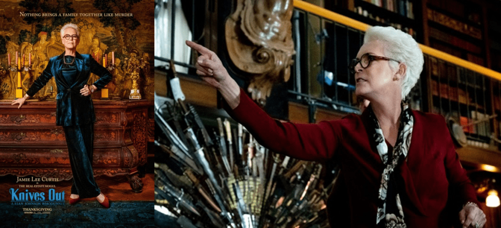 Y aprovechando que Jouis y Addie nos dan la espalda y se marchan juntos, termino este recorrido con Puñales por la espalda (Rian Johnson, 2019). Si algunos crímenes se resuelven con pistas, en otros es con jerséis. En esta película el misterio no se desarrolla solo a través de la intriga, los giros de guion y las revelaciones familiares: también se insinúa en cada prenda. El vestuario no es solo un complemento, sino una herramienta para leer lo que los personajes no dicen. Y Jenny Eagan, diseñadora de vestuario con un agudo sentido narrativo, construye una galería de sospechosos tan estilísticamente sofisticada como emocionalmente cuestionable.