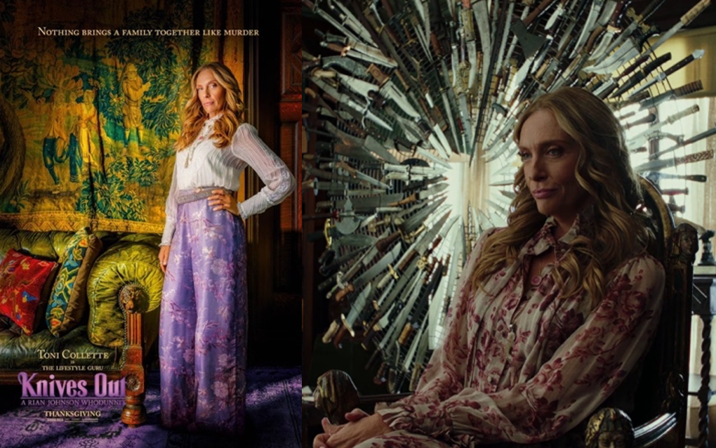 Joni (Toni Collette), gurú del bienestar de bolsillo, combina capas de tejidos fluidos, estampados new age, gafas gigantes y turbantes con flecos. Es una parodia maravillosa de la espiritualidad de boutique.
