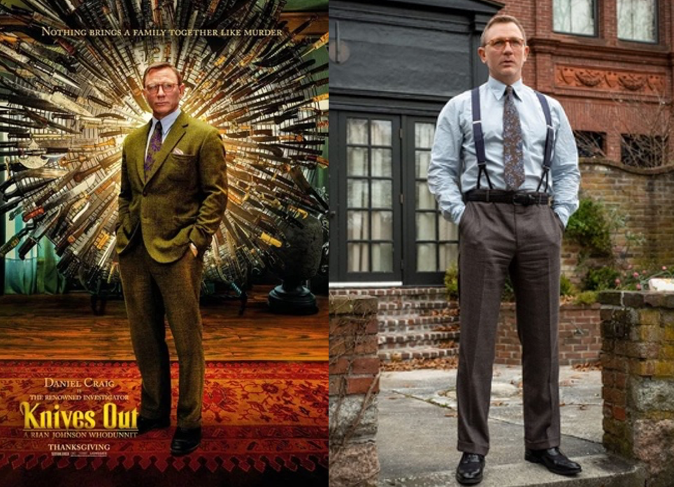 Igualmente, el detective Benoit Blanc (Daniel Craig) está cuidadosamente vestido: traje gris de tres piezas, corbata de nudo simple, pañuelo en el bolsillo. Su aspecto podría recordar a un estilizado Poirot de Agatha Christie, pero sin la afectación. Blanc se viste como si fuera a una cena de gala en un club de campo… aunque se esté colando en la cocina.