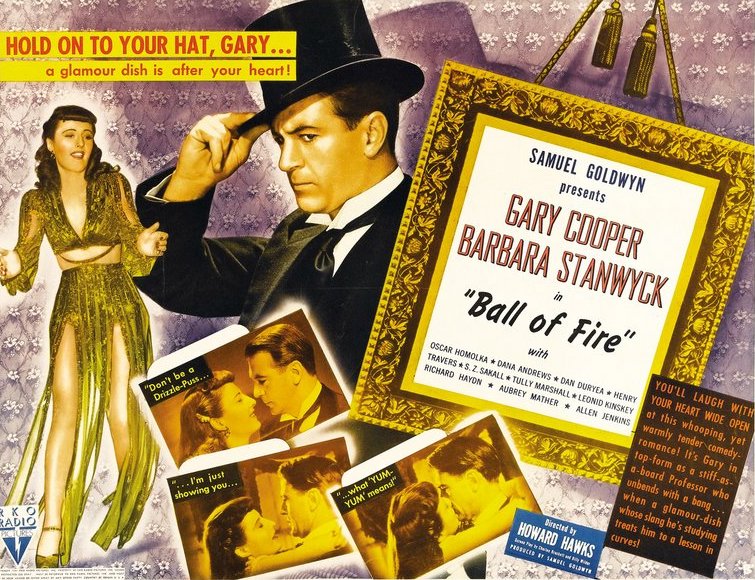 En la siguiente parada, la actriz repite, pero con un giro aún más marcado: de estafadora elegante a cabaretera descarada. En Bola de fuego (Howard Hawks, 1941), la llegada de la explosiva Sugarpuss O’Shea (Barbara Stanwyck) al austero hogar de los eruditos remite al cuento de Blancanieves y los siete enanitos: una mujer de mundo irrumpe en un entorno masculino e inocente, desordenando su rutina con la misma mezcla de encanto y transformación que trajo Blancanieves al bosque. El más afectado es el profesor Potts (Gary Cooper), un lingüista tan ordenado como ingenuo, que nunca había oído ciertas expresiones (ni sentido ciertas emociones).