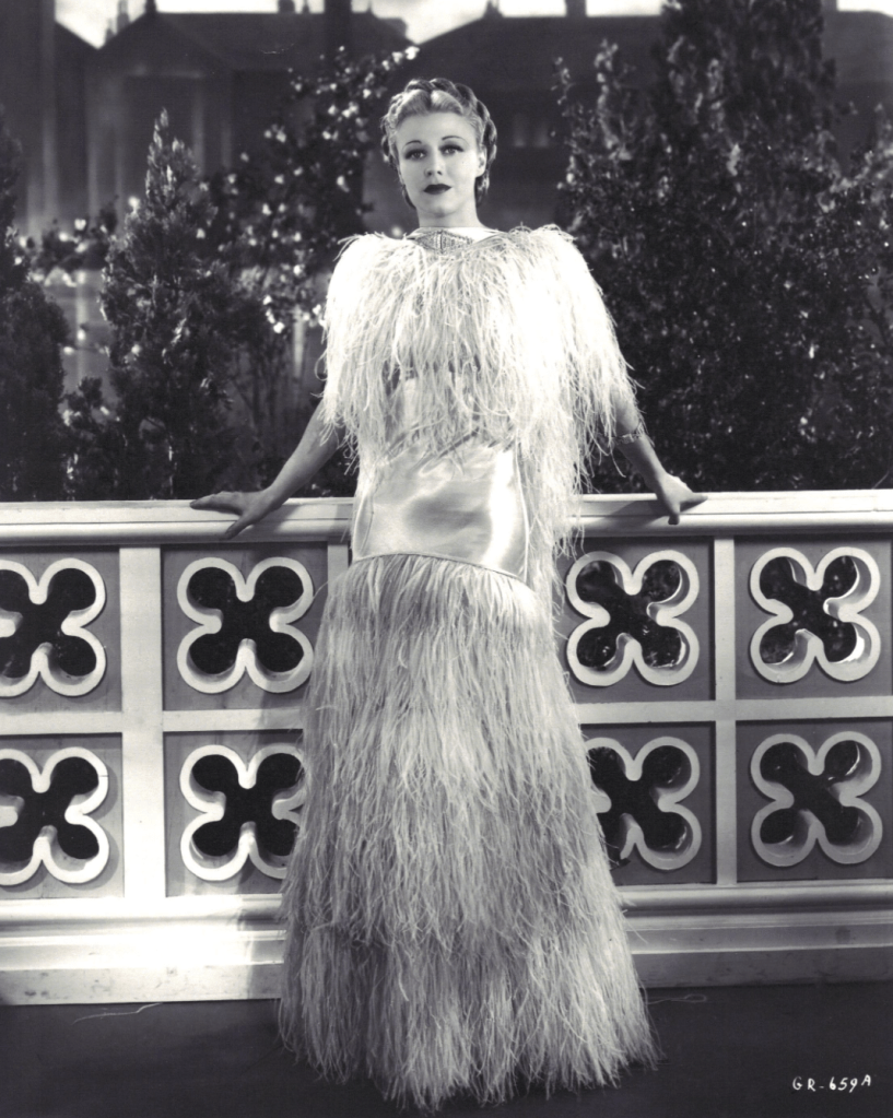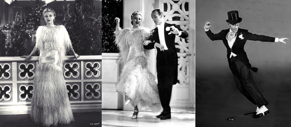 Ginger Rogers, por su parte, se mueve en otra clave. Sus vestidos, de gasa y seda, diseñados también por Newman, son pura ingravidez. El más recordado, sin duda, es el que lleva durante el número “Cheek to cheek”, elaborado con plumas: un diseño etéreo que acompaña los giros de la actriz amplifica sus brazos y envuelve el cuerpo como si fuese aire en forma de tela. El vestido pesaba aproximadamente 7 kilos, algo considerable para una prenda de baile. Estaba hecho de tela azul pálido y cubierto de cientos de plumas de avestruz, diseñadas para flotar con gracia cuando Ginger Rogers se movía. Las plumas se soltaban constantemente durante la grabación, lo que irritaba a Fred Astaire, que incluso escribió en sus memorias que acabó “comiendo plumas” durante la escena. Estas también interferían con la precisión de los pasos, sobre todo porque los bailes de Fred Astaire requerían una sincronización exacta. Astaire llamó al vestido en tono de broma “la pesadilla de plumas”. Sin embargo, visualmente resume la paradoja de Dale: es elegante, sí, pero también libre, sensible, contradictoria.