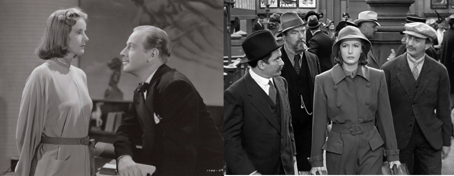 A partir de ahí, el vestuario de Ninotchka se suaviza: aparecen vestidos con caída, guantes blancos, un sombrero con velo… En una de las escenas finales, la vemos con un abrigo claro y una blusa con cuello abierto, tan distinta a la mujer que aterrizó con botas cerradas y mirada severa, que parece otro personaje. Pero no lo es. Es la misma Ninotchka… descosida y vuelta a coser, con una costura más íntima.