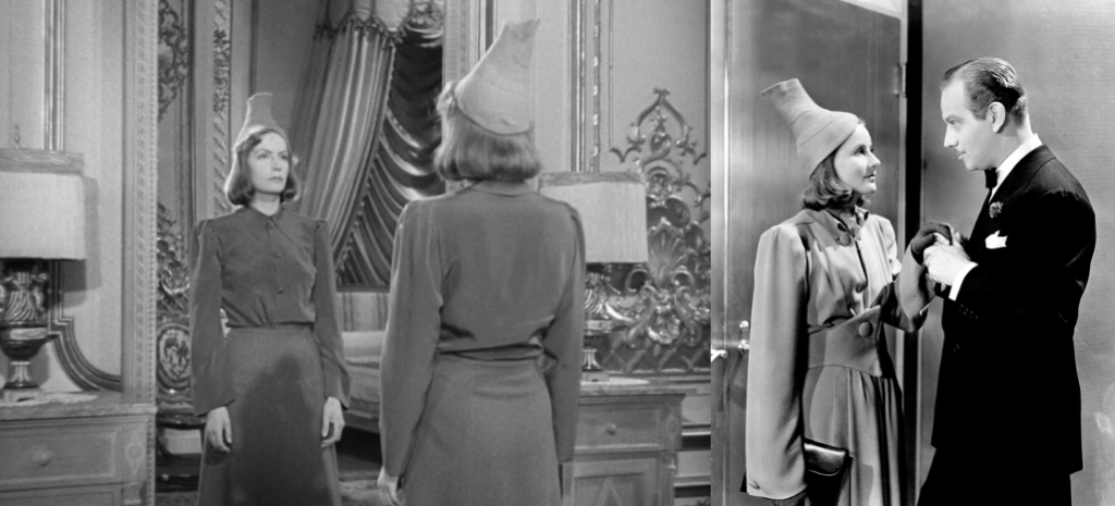 Pero Lubitsch no tarda en desmontarla. Cuando Leon la lleva a probarse un sombrero exageradamente glamuroso y extravagante, ella lo observa con desdén… y luego estalla en carcajadas. Ese instante no solo cambia el tono de la película, sino también su silueta. Este sombrero, de forma cónica y peculiar, fue diseñado por Adrian, basándose en un boceto de la propia Garbo. Representa la transformación interna de Ninotchka. Su adquisición simboliza su apertura a las emociones y placeres personales, alejándose de la rigidez ideológica que la caracterizaba. Este cambio es central en la narrativa de la película, mostrando cómo el personaje se humaniza y se deja llevar por sus sentimientos.