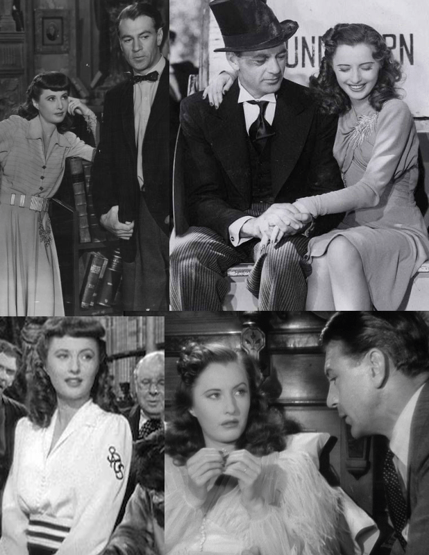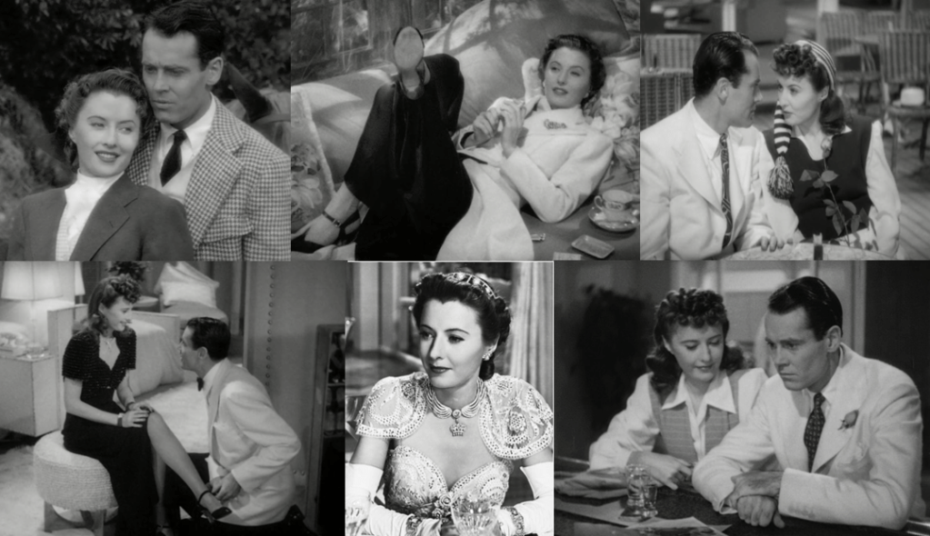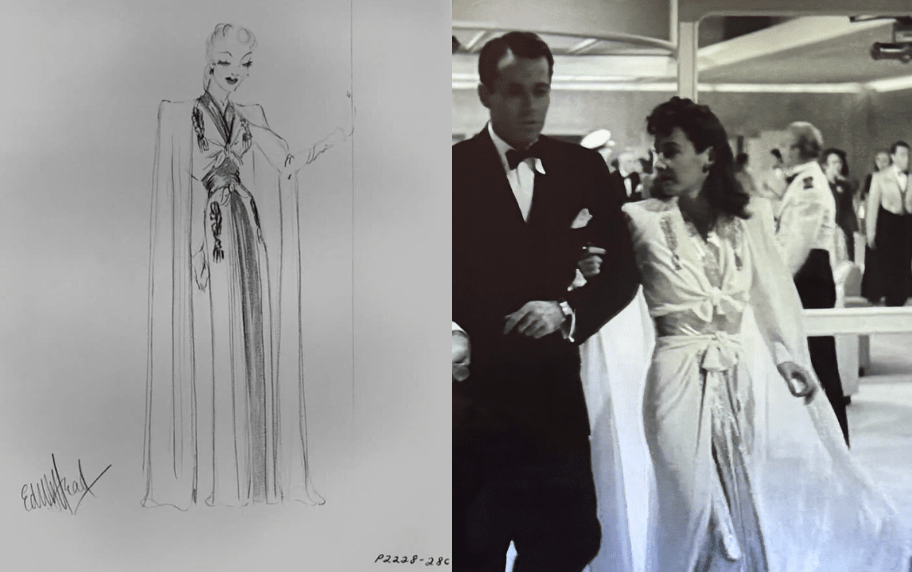Barbara Stanwyck, con diseño de Edith Head, interpreta a Jean con una mezcla explosiva de sofisticación, malicia y carisma. Sus vestidos son ceñidos, con escotes pronunciados, mangas dramáticas y texturas brillantes. El vestido de satén blanco que lleva durante la cena en el barco es una obra de precisión narrativa: cortado al bies, con drapeados que juegan con la figura sin caer en lo evidente, expresa tanto el control absoluto que ella tiene de la escena como la teatralidad de su personaje. Cada prenda que lleva Jean es parte del guion que ella misma escribe para seducir y burlar al ingenuo Charles.