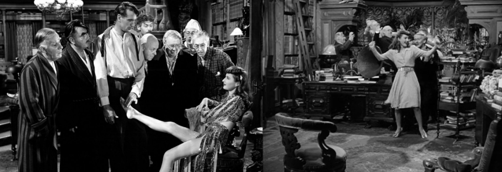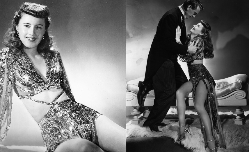 También repite Edith Head para volver a vestir a Barbara Stanwyck con una colección espectacular de vestidos de lentejuelas, transparencias estratégicas y abrigos de piel. El más icónico (el vestido ajustado que lleva en la escena donde enseña jerga callejera a los académicos) es una lección de ironía visual: cuerpo contenido en tela brillante, mujer libre en un entorno de reglas.