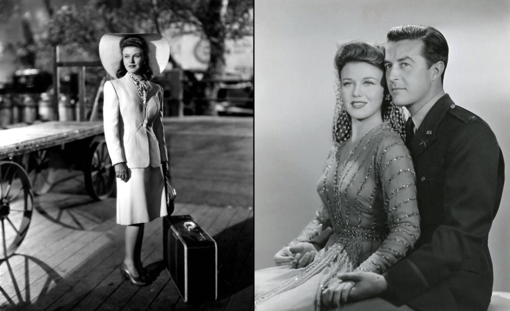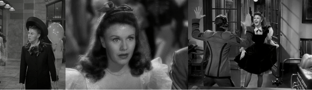 Betty Grable, por su parte, lleva estampados más lúdicos, tonos pastel, sombreros que rozan el exceso: su personaje es el más cercano a la comedia física, y su vestuario lo subraya.