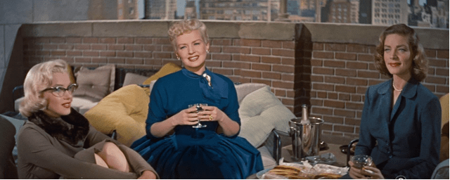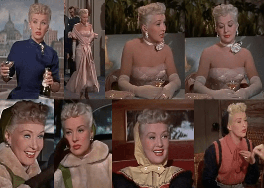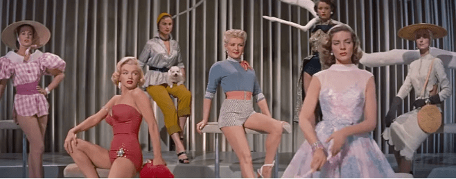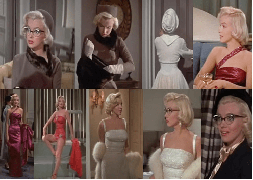 Marilyn Monroe (en uno de sus papeles más entrañables) interpreta a una modelo miope que se niega a llevar gafas en público. Travilla juega con colores suaves, tejidos que se amoldan al cuerpo y detalles delicados que contrastan con su torpeza visual: el vestido rojo de cóctel en la secuencia del restaurante es un prodigio de construcción que disimula y revela al mismo tiempo.