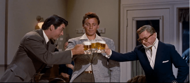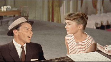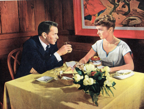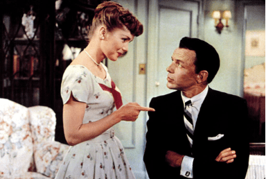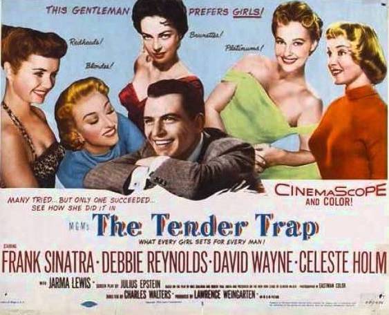 Frank Sinatra, siempre cómodo en el papel del galán urbano, viste con trajes grises impecables, corbatas finas, camisas blancas con gemelos discretos y ese pañuelo perfectamente doblado que asoma del bolsillo de la americana. Su personaje es un manual del hombre moderno de la época que conquista sin esfuerzo. Helen Rose, diseñadora habitual de las grandes estrellas de la MGM, dota a Debbie Reynolds de un vestuario que parece sacado de una boutique sofisticada de Park Avenue: faldas midi, chaquetas entalladas, guantes de encaje y sombreros delicados. Todo en ella habla de contención, de normas, de una feminidad que se proyecta hacia el altar.