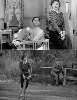Hay dos secuencias destacadas en la película, tanto narrativamente como por la motivación de su vestuario. Incluso de su “no-vestuario”. Ambas tienen una carga sexual evidente y siempre en lucha el uno contra el otro. La primera tiene lugar en el motel donde deben dormir la primera noche. Él se quita la camisa y, para sorpresa de ella (y del espectador de la época) deja su torso desnudo al no llevar camiseta interior. “Este soy yo” parece decirle con socarronería. La siguiente batalla es en la famosa escena en que él trata de enseñarle cómo hacer autostop, pero es ella quien acaba dándole una lección de efectividad al subirse la falda y estirar su pierna con media sobre la carretera. “Y esta soy yo” parece responder ella ahora. Definitivamente demuestran ser un roto… para un descosido.