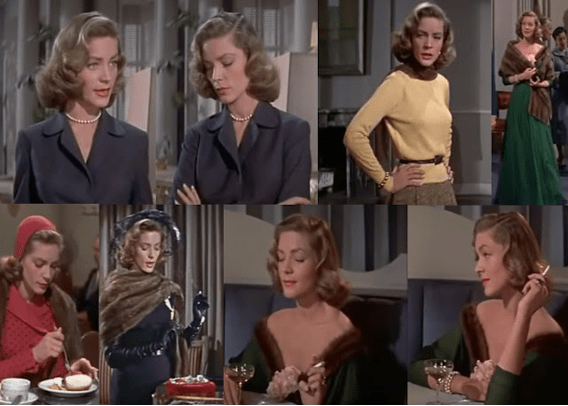 Lauren Bacall luce trajes sastre con faldas lápiz, líneas puras y escotes estructurados: su personaje es cerebral, estratégico, y el vestuario lo refuerza con una elegancia fría.