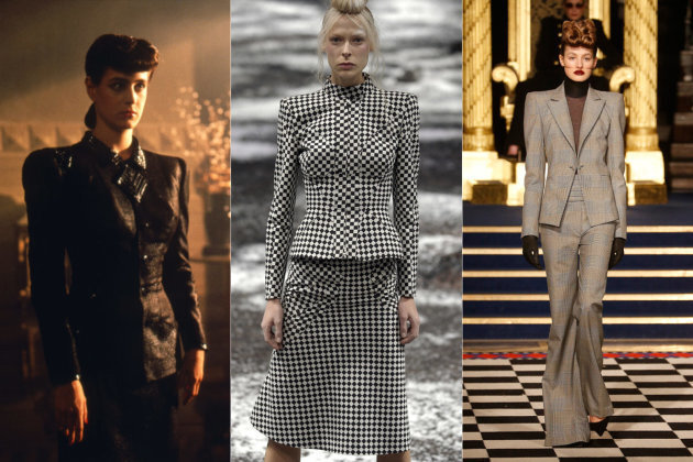 Una de las claves que han convertido a esta película en protagonista de la historia de la moda de las últimas décadas fueron los trajes de Rachael para los que Kaplan se inspiró en Adrian y Schiaparelli. Al igual que su peinado, los trajes de chaqueta con pronunciadas hombreras de la actriz Sean Young hacen un viaje al pasado de los 40. Los hemos visto replicados en infinidad de desfiles como los de la imagen: Alexander McQueen (FW 2003/04) y Gareth Pugh (FW 2016/17).