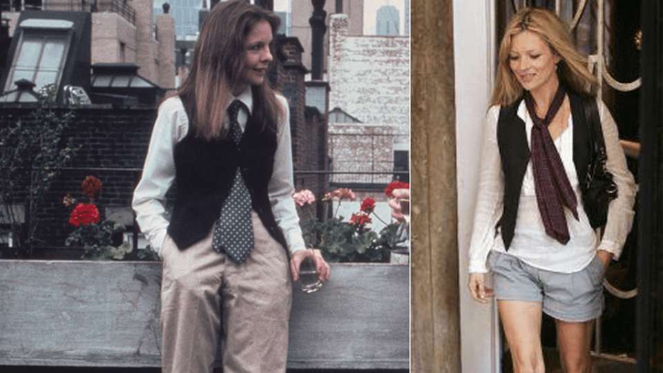 Como en la moda y en el cine todo vuelve, así sucedió en los setenta con Annie Hall (1977) en la que Diane Keaton actualizó el estilo masculino para la mujer del que hemos hablado antes. Puso de moda los pantalones de tiro alto, los chalecos, las corbatas y hasta las gafas redondas tipo Lennon. La propia actriz, reconocida admiradora de Katharine Hepburn, se encargó de elegir ese vestuario, que se sube a las pasarelas y vuelve a ponerse de moda cada ciertas temporadas. Modelos y actrices como Kate Moss o Blake Lively han imitado ese estilo.